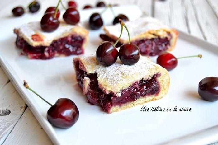 Un postre jugoso y dulce con cerezas maceradas, sobre una base de masa tierna y un toque de azúcar glas.