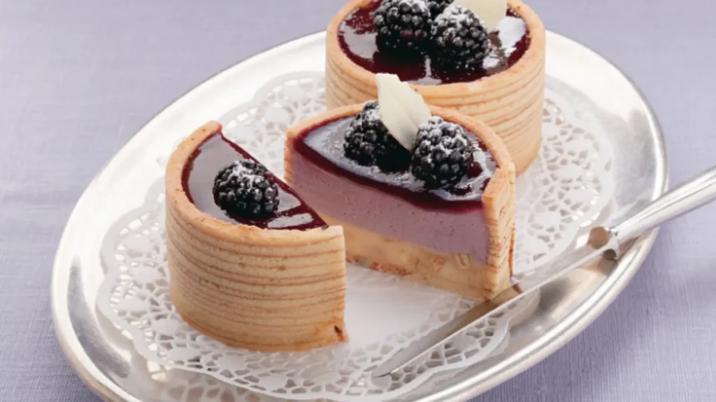 Masa dorada y crujiente rellena de crema y moras jugosas, ideal para los amantes de los sabores frutales y dulces.
