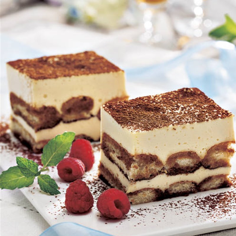 Postre italiano con capas de bizcocho empapado en café, crema mascarpone y cacao espolvoreado. Elegante y suave.